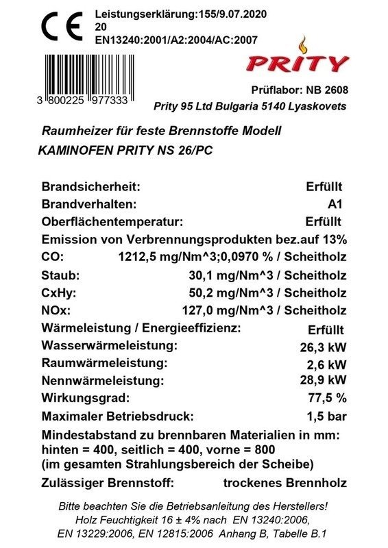 | Brennstoffe | Holz, Holzbriketts (Kohle nicht geprüft) |